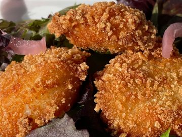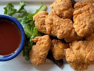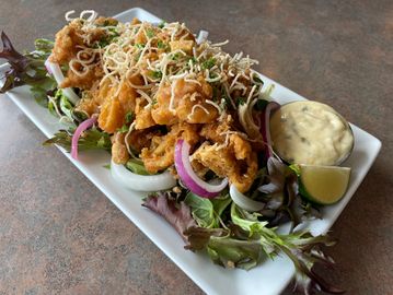 Sweet, tender scallops, hand-breaded in-house with our seasoned breadcrumbs and cooked to golden perfection. Served on a bed of fresh spring mix and onions, with a side of seafood sauce and a fresh lemon wedge.
