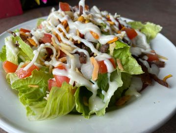 A bed of fresh spring mix and onions, topped with tender pieces lightly breaded in seasoned breadcrumbs and finished with a crunch of crispy Bombay Mix. Served with Annie’s Signature Sauce and a fresh wedge of lime.